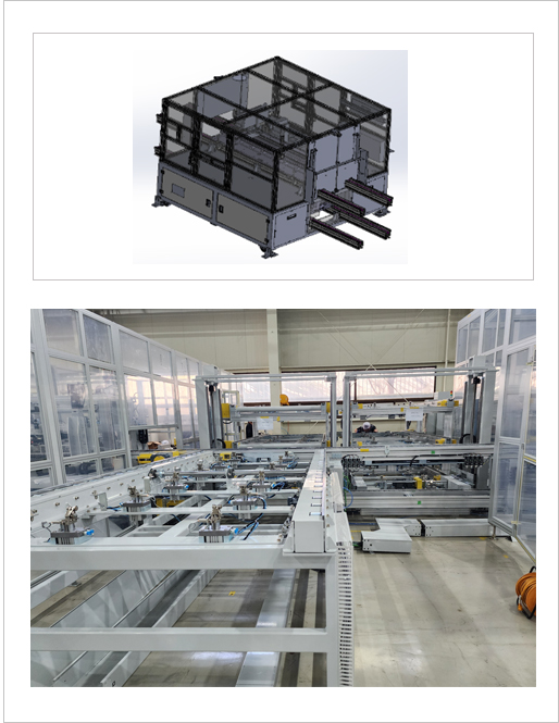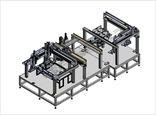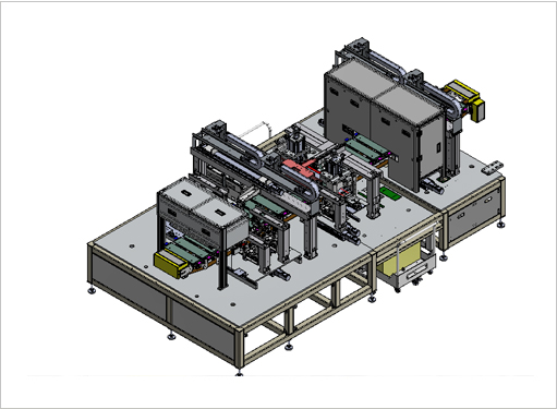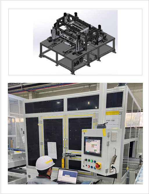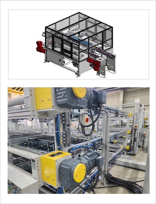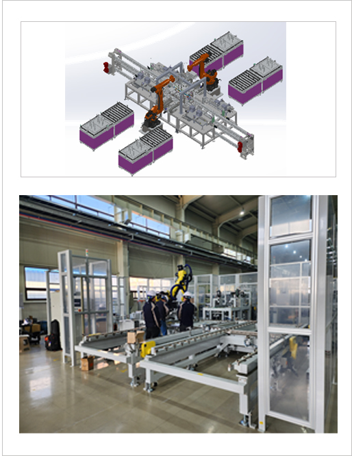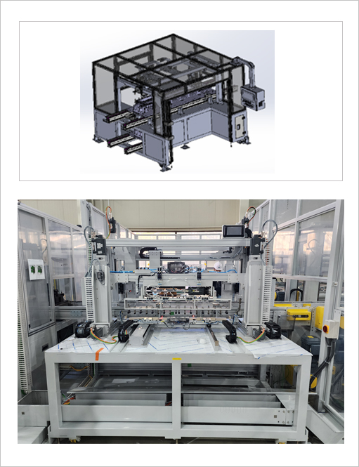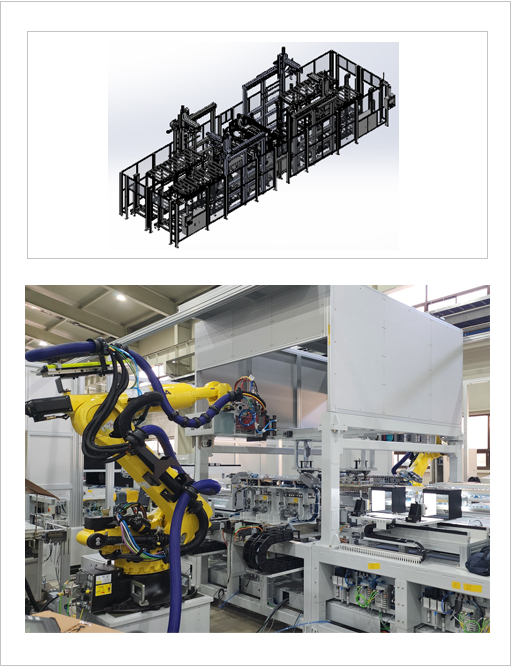 각형 셀 적층 자동화 조립 라인은 기존 각형(Cell) 배터리의 CCS (Cell Connector System)용접 구조는 상면(Top)에 구성되는 방식이 일반적이지만 당사에서는 측면(Side) CCS 용접 구조로 개발 및 적용하여 협소한 공간에서 CCS를 안정적으로 공급하고 용접의 안전성을 확보하는 구조 방식 입니다.